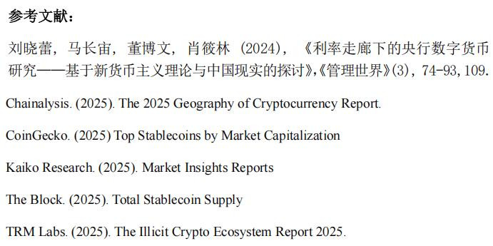 对于新兴经济体和发展中国家而言,美元稳定币的急剧膨胀则带来了严峻考验:存在资本管制的国家,美元稳定币可能成为资本外逃的新渠道;面临高通胀的国家,本地货币被美元稳定币替代的风险显著上升。如在土耳其、尼日利亚和阿根廷,美元稳定币已大量用于储蓄以对冲本币贬值,并成为规避外汇管制和进行跨境贸易支付的重要渠道(Chainalysis,2025;TRMLabs,2025)。美元稳定币在这些地区的应用,已呈现出“数字美元化”的早期迹象,对当地货币主权构成了潜在威胁(KaikoResearch,2025)。